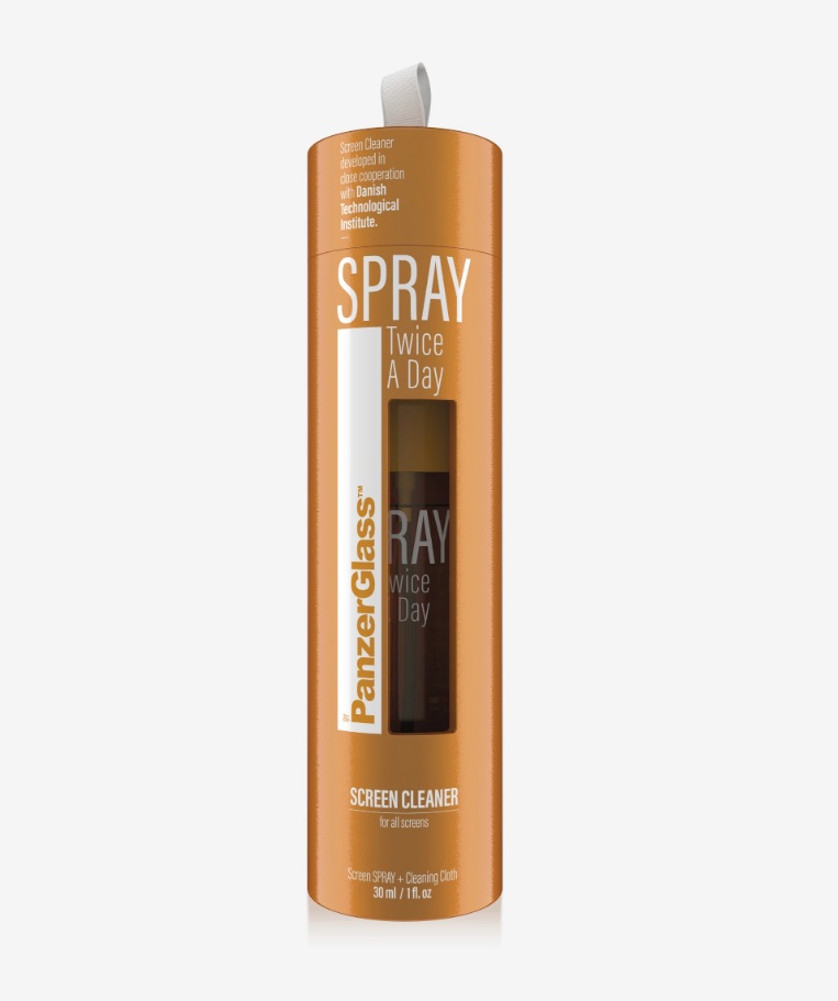 Čistiaci roztok SPRAY Twice A Day, vyvinutý v spolupráci s Dánskym Technologickým Inštitútom. Jeho použitie je určené na všetky povrchy technologických obrazoviek ako napríklad mobilný telefón, tablet, notebooky ale aj okuliare. Neobsahuje žiadne alergény, parfumy, alkohol a všetky zložky sú prírodného pôvodu. SPRAY Twice a Day úspešne spĺňa požiadavky normy ISO 1276 pre antimikrobiálnu aktivitu pre všetky štyri testované druhy. Ak je výrobok schválený podľa ISO 1276 znamená to, že úspešne usmrtil 99,999% pridaných mikroorganizmov zo všetkých štyroch testovaných organizmov, t. j. len 1 mikroorganizmus zo 100 000 zostane živý po kontakte s čistiacim roztokom. Toto dokumentuje antibakteriálny účinok na široké spektrum mikroorganizmov. Testované mikroorganizmy - najmä E. coli, S. aureus a P. aeruginosa - sú súčasťou najbežnejších infekcií, ktoré sa prenášajú z človeka na človeka priamym kontaktom, zvyčajne rukami. Je všeobecne známe, že na telefónoch sa prenášajú infekčné mikroorganizmy a keďže sa používajú niekoľkokrát denne, opakovane dochádza k prenosu mikroorganizmov medzi telefónom a rukami. Sprej Twice A Day preukázal antimikrobiálne účinky pre všetky tieto druhy baktérií podľa ISO 1276. Vďaka tomu je prenos mikroorganizmov medzi rukami a telefónom výrazne zredukovaný. Balenie okrem samotného spreja obsahuje aj čistiacu handričku z mikrovlákna.