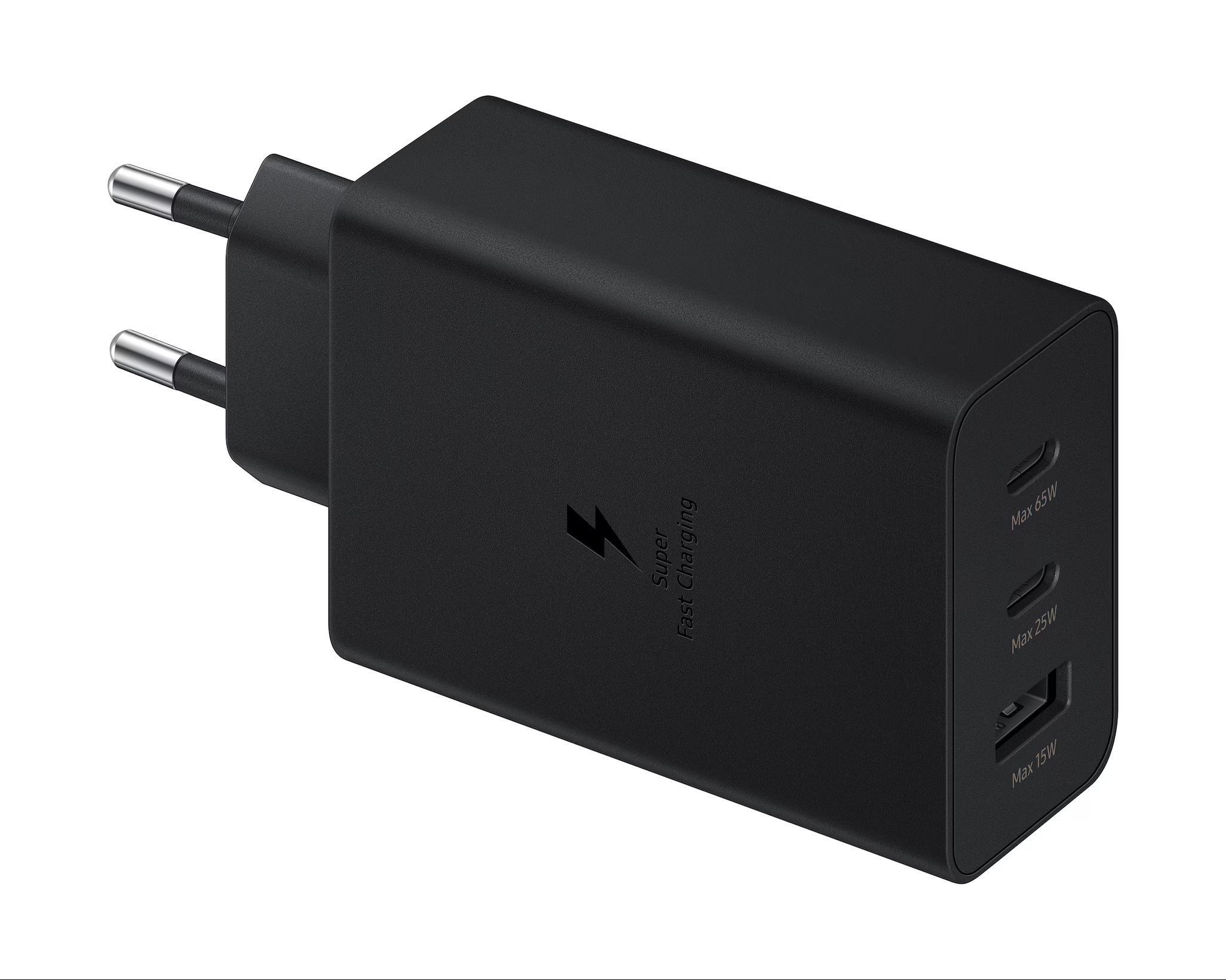 Cestovný adaptér s rýchlonabíjaním EP-T6530 značky Samsung s výkonom 65 W. Tento výkonný a univerzálny nabíjací adaptér umožňuje nabíjať až tri zariadenia súčasne. Vďaka trom výstupným portom – dvom USB-C a jednému USB-A – poskytuje maximálny výkon až 65 W, pričom jednotlivé porty dokážu dodávať energiu s výkonom 35 W, 25 W a 5 W. Podporuje technológie USB Power Delivery 3.0, Super Fast Charging (SFC) 2.0 a Adaptive Fast Charging (AFC), čím zabezpečuje rýchle a bezpečné nabíjanie kompatibilných zariadení vrátane smartfónov, tabletov, notebookov či bezdrôtových slúchadiel. Adaptér je vybavený pokročilými bezpečnostnými prvkami, ktoré chránia pred prepätím, skratom a prehriatím, a jeho spoľahlivosť bola testovaná nezávislými laboratóriami TÜV SÜD a CTK Korea. Vďaka kompaktnému dizajnu a čiernemu prevedeniu je ideálny na domáce aj cestovné použitie. (Nabíjací kábel nie je súčasťou balenia, odporúča sa použiť 5A kábel pre dosiahnutie maximálneho výkonu.)