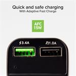 Vďaka dvom USB portom môžete nabíjať až dve zariadenia súčasne. Ak ho pripojíte k zelenému USB portu, autoadaptér vám poskytne výkon 15 W a umožní rýchle nabitie zariadenia. Technológia Adaptive Fast Charge (AFC) reguluje vydávaný výkon v závislosti od nabíjaného zariadenia, aby sa zaručilo bezpečné napájanie.